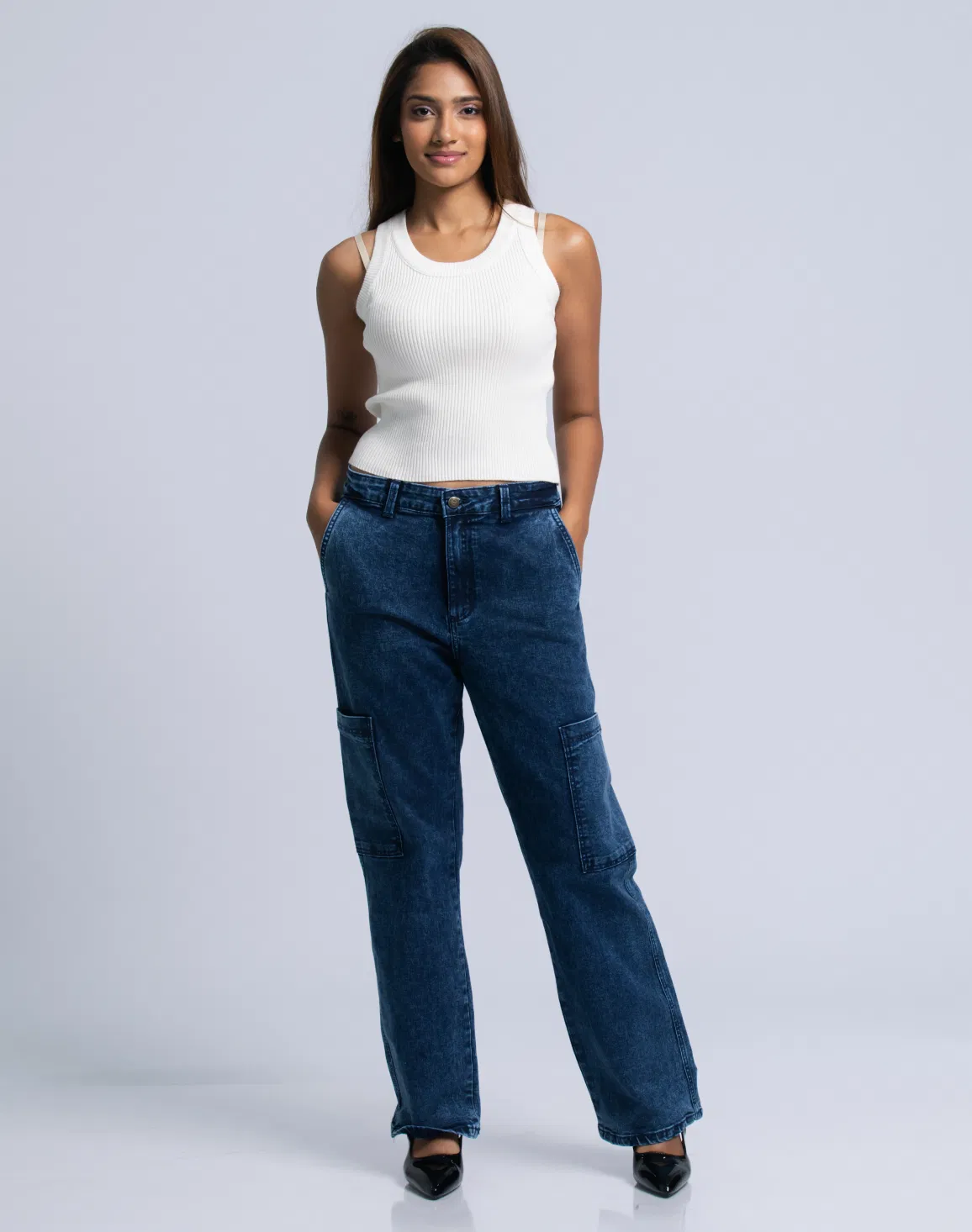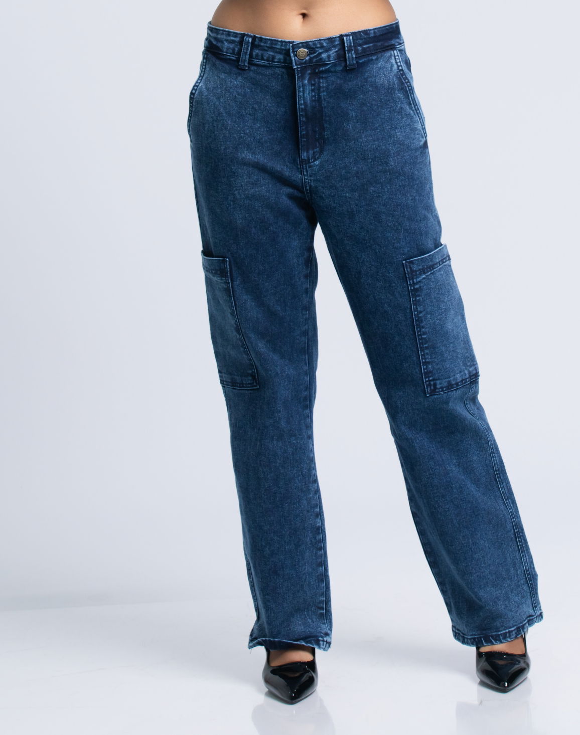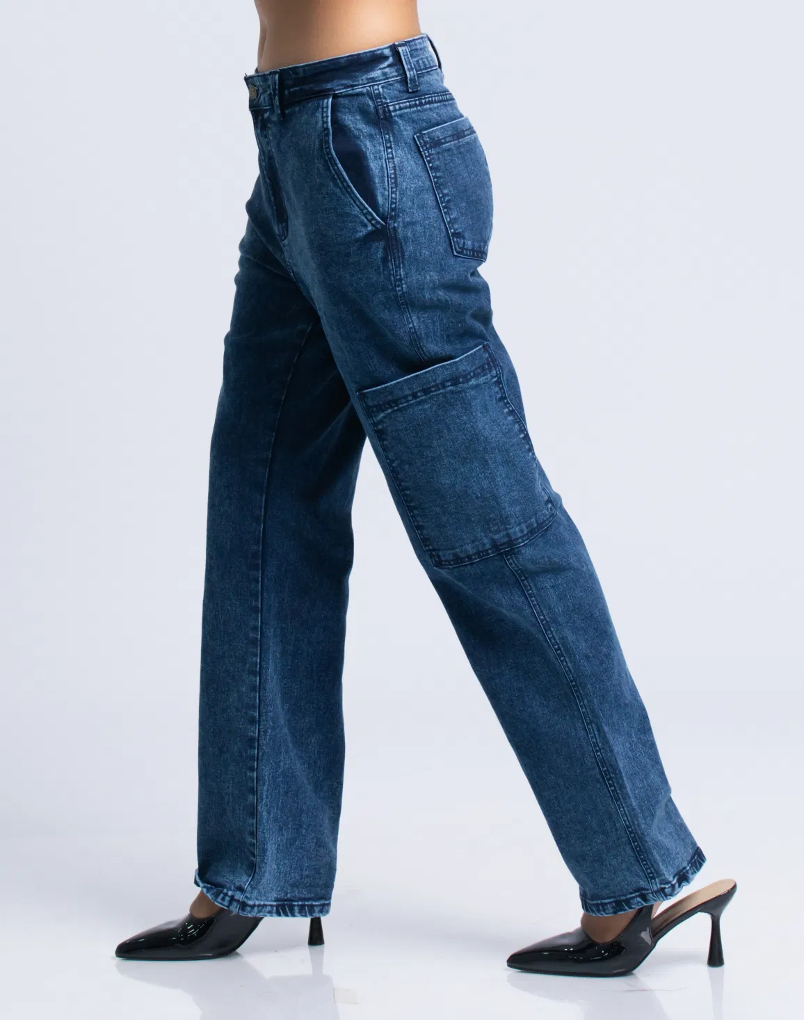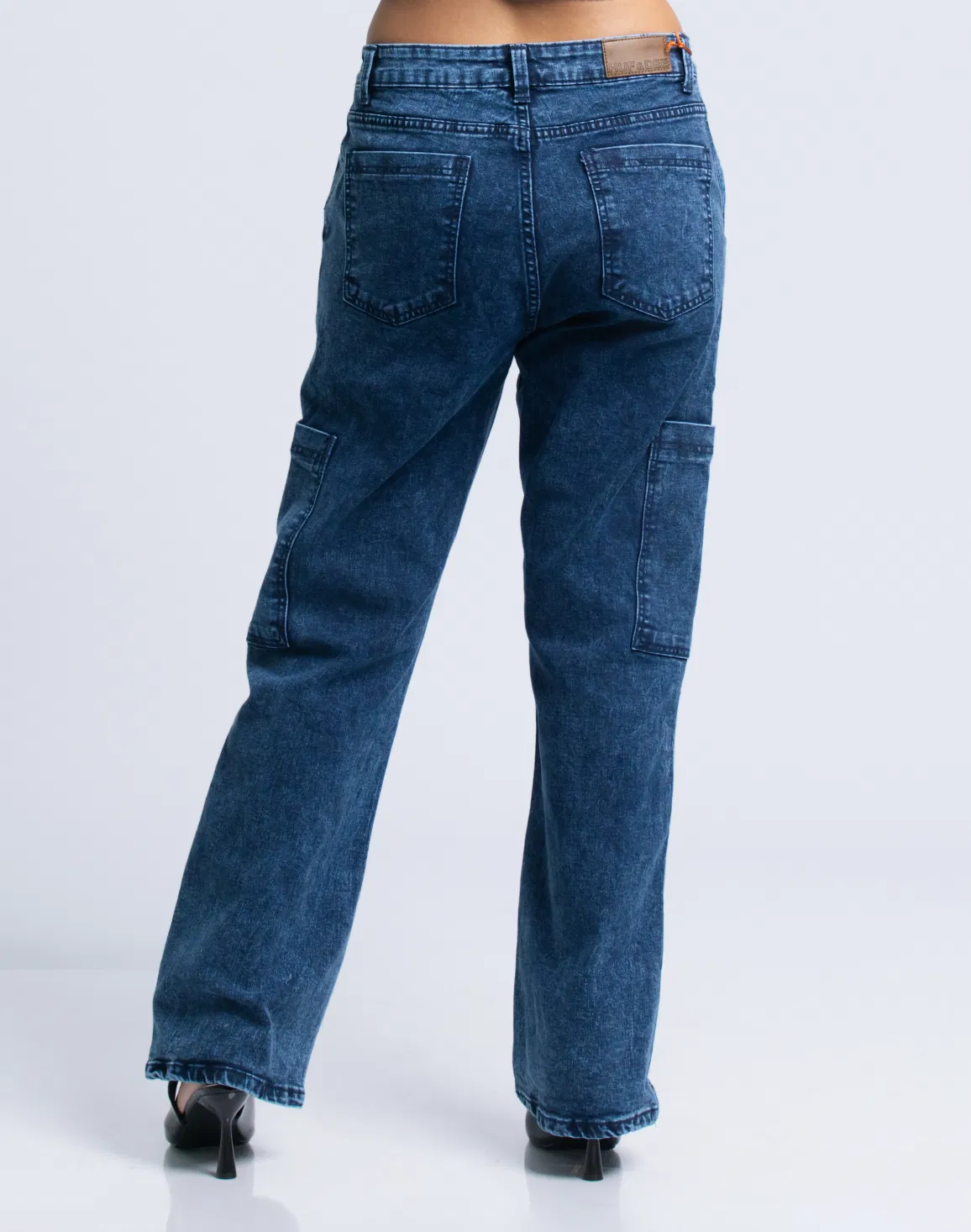 HUF & DEE Women's Wide Leg Cargo Jeans Mid Blue